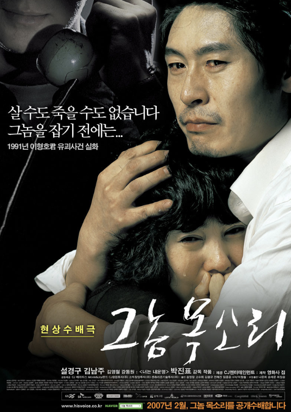 2007년 박진표 감독의 그놈 목소리는 실화를 바탕으로 한 유괴·살인 사건을 영화적 장치로 치밀하게 재구성한 작품이다. 화면보다 소리가, 가해자의 얼굴보다 전화기 너머의 목소리가 이야기의 중심에 서며, 부모가 겪는 무력감과 한국 사회가 공유한 집단적 공포를 날것 그대로 끌어올린다. 설경구와 김남주의 절절한 연기는 상실을 겪는 부모의 내면을 사실적으로 묘사하고, 보이지 않는 범인을 소리와 시간, 일상의 디테일로 현존하게 만드는 연출은 한국 스릴러의 미학을 한 단계 확장한다. 이 영화는 범죄의 잔혹함을 소비하는 대신, 피해자 가족의 체류하는 고통과 수사의 한계, 여론과 미디어의 압력을 성찰적으로 응시한다.