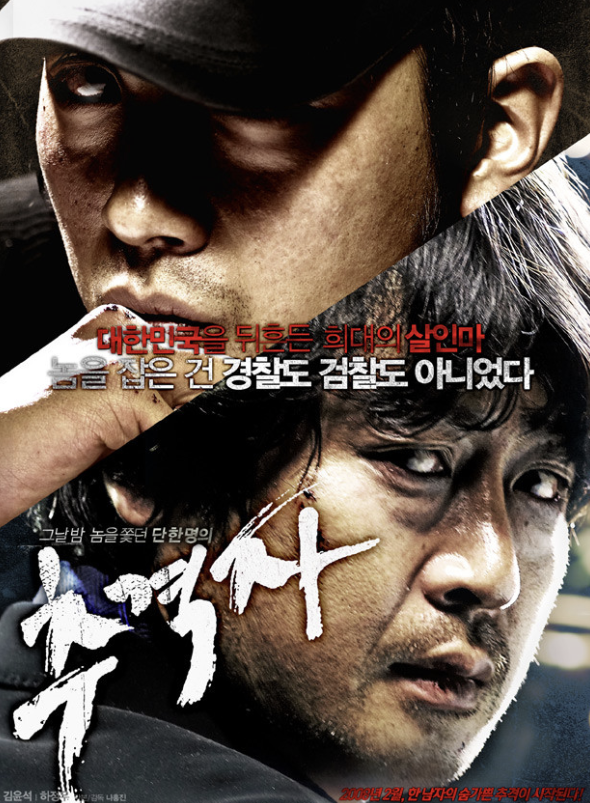 이야기는 중호(김윤석)가 관리하던 여성들이 하나둘 연락이 끊기면서 시작된다. 그는 우연히 동일한 고객이 반복적으로 등장했다는 사실을 알아차리고, 그를 의심하기 시작한다. 이 고객이 바로 연쇄 살인범 영민(하정우)이다. 중호는 실종된 미진(서영희)를 찾아내기 위해 끈질기게 영민을 쫓고, 결국 그를 붙잡는 데 성공한다. 그러나 문제는 여기서 시작된다. 경찰은 영민을 체포하고도 증거 불충분을 이유로 그를 석방하려 한다. 영민은 경찰서에서 자신이 저지른 범행을 시인하지만, 그 고백조차 법적 증거로 채택되지 못한다. 영화는 범인을 잡았음에도 제도적 허점 때문에 풀려나는 아이러니를 통해 시스템의 무능을 적나라하게 드러낸다. 중호는 홀로 미진을 구하기 위해 사투를 벌이고, 마지막 순간까지 그녀를 찾아 헤맨다. 하지만 영화는 끝내 구원의 결말을 허락하지 않으며, 추적과 절망이 교차하는 강렬한 엔딩으로 관객의 뇌리에 깊은 흔적을 남긴다.